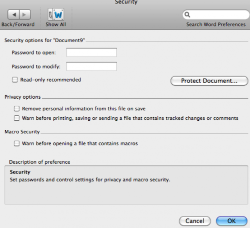 You can choose to protect your document by setting a password to open, setting a password to modify, or both.