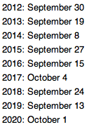 The Festival is celebrated on 15th August in the Chinese Calendar which is a lunisolar calendar. The dates for the next few years are displayed below: